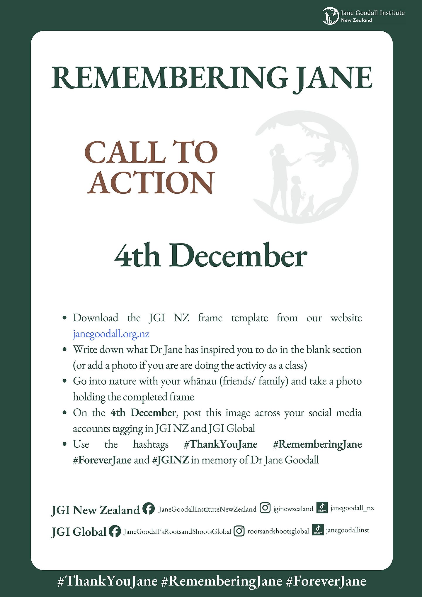 On Thursday 4th December, The Jane Goodall Institute New Zealand will honour the extraordinary life and legacy of Dr. Jane Goodall, DBE. To ensure that as many people as possible can join us in celebrating Dr. Jane’s life and pay their respects we are going to host a simple interactive activity that everyone can do at home.